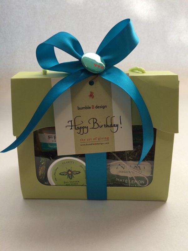 The small birthday box includes a Happy Birthday Music Box, organic Flying Bird teas, Big Dipper Wax Works’ beeswax travel candle with 100% essential oils, some sweet treats, a 100% biodegradable Bee Balm (all-natural lip/skin balm), a birthday sparkler, and your personalized birthday message. The medium size comes with everything in the small plus a Happy Birthday sea salt caramel and dark chocolate bar, and additional seasonal snacks. The large size includes extra snacks from Almond Blossom and Chukar Cherries, a bath cube from Baudelaire, and your choice between a Big Dipper stoneware candle with Frankie & Claude matches, Manoa chocolate-covered macadamia nuts, or a Liberty water bottle with a fun sticker. Sticker options: heart, Sasquatch in the mountains, Pacific Northwest. Please specify your preference for the large size in the Order Notes upon ordering: chocolate-covered macadamia nuts from Manoa, or larger candle, or water bottle & sticker.