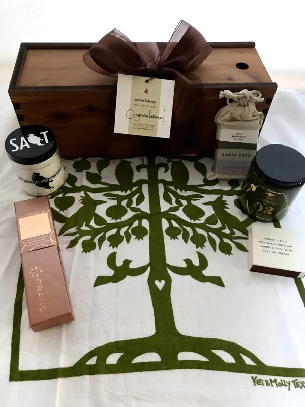 This beautifully made cedar box from WoodChuck Co. with a sliding lid reveals a hand-printed tree towel from Kei & Molly, handmade soap from Bell Mt., San Juan Sea Salt, Fran’s Chocolate Caramels, a beeswax aromatherapy candle from Big Dipper Wax Works, and a house match box from Frankie & Claude.