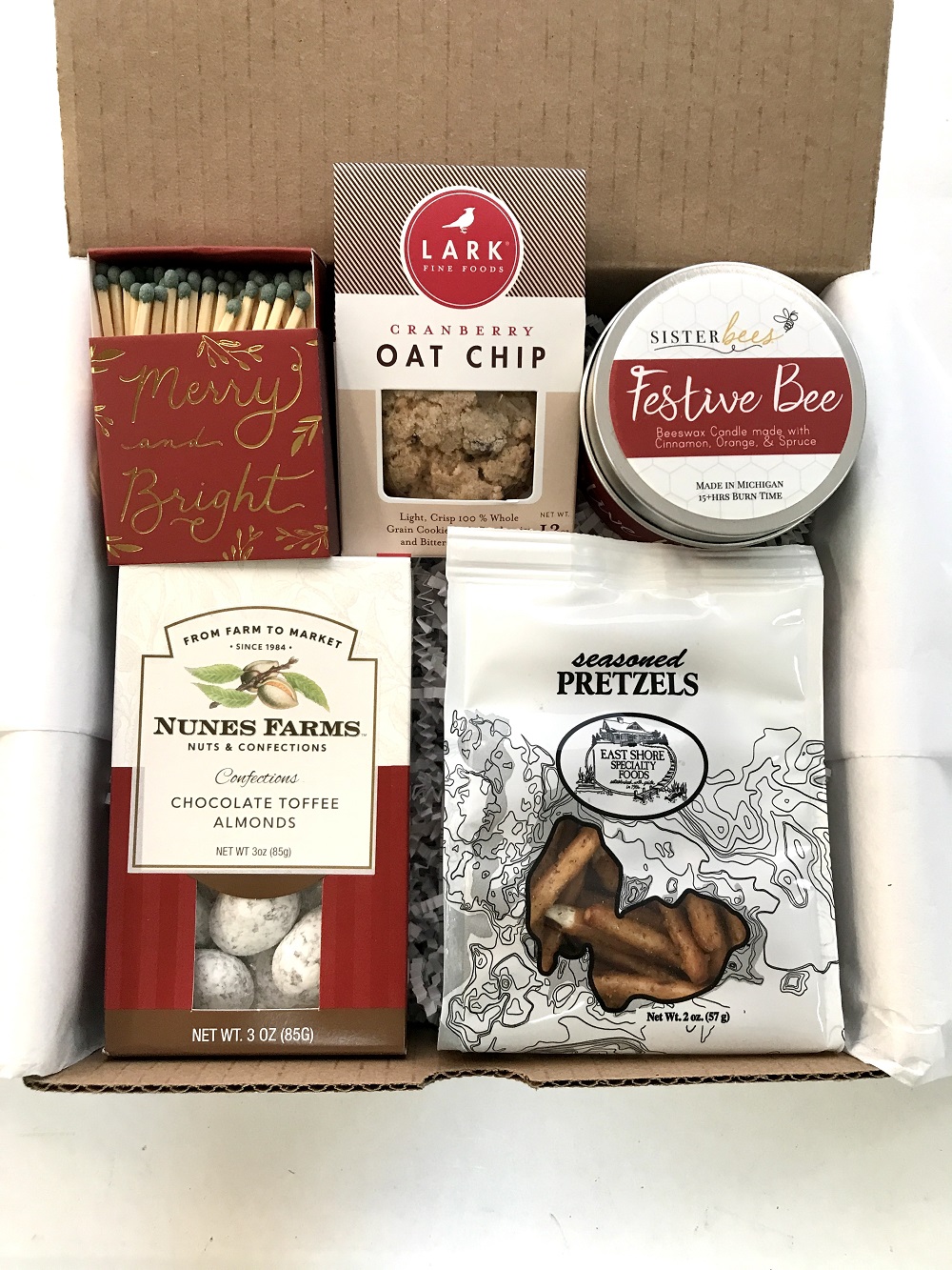 Send some holiday cheer with this festive box for an 1-2 people to enjoy. Includes a holiday beeswax candle, “Merry & Bright” matchbox, chocolate covered almonds, seasoned pretzels & seasonal cookies. Can come with our signature bumble B design card with your message beautifully handwritten on the back, or your business logo (allow lead time for business customizations).