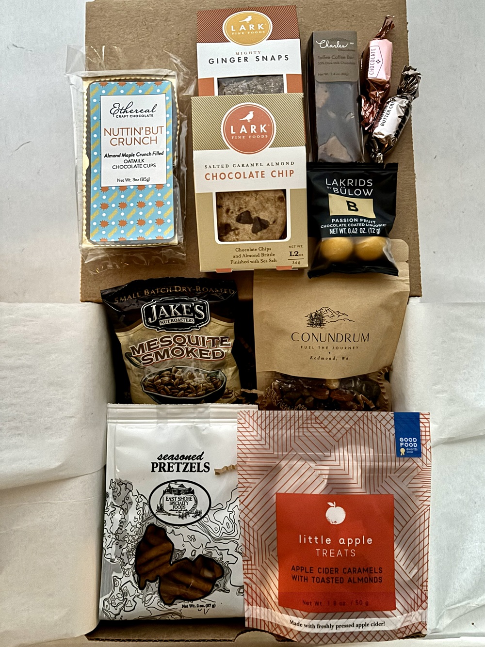 Outstanding seasonal cookies, salted nuts, chocolates, caramels, & pretzels comprise this popular gift. Select “holiday” if you want the box to contain seasonal or holiday specific products & packaging. Let us know in the Order Notes if it needs to be vegan, Kosher, gluten-free, dairy-free, etc. Can be made at the $150, $200, $250, & $300 price points & customized with your pre-printed business merchandise or logo if time allows. Please submit a Contact Form if interested in our largest Munch Box sizes.