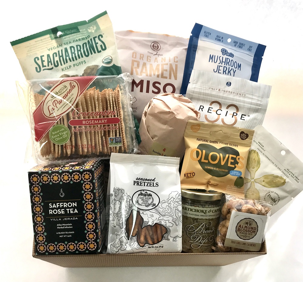 Our Vegan Snack Basket features delicious savory snacks and a few sweet snacks. Not boring or bland! See Product Description for more details.