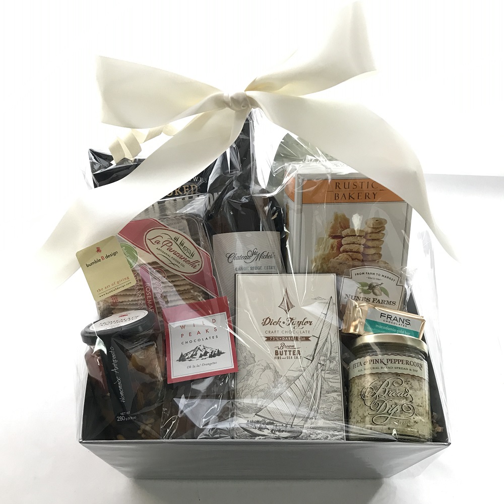 This basket features Chateau Ste. Michelle’s Cabernet Sauvignon from Washington plus an array of seasonal sweet and savory gourmet snacks that pair well with wine including high quality chocolate (Fran’s, Dick Taylor, &/or Dolcetta Artisan Sweets), seasoned nuts, Beecher’s (Flagship Cheddar or gluten-free Serious Cheese) or La Panzanella crackers, cheese or a vegie spread (artichoke, sundried tomato, or mushroom), smoked salmon, olives, and other seasonal treats. The small basket includes Chateau Ste. Michelle’s Canoe Ridge Cabernet Sauvignon; the medium and large features Chateau Ste. Michelle’s Cabernet Sauvignon Horse Heaven Hills/Special Sites Collection, and also features more gourmet snacks & chocolates. Can be made with only wine & chocolate, or wine & savory snacks. Please specify wine & dietary choices, & if the basket should contain specific holiday/celebration items upon ordering in the “Order Notes.” For hand-delivery to most Seattle locations (we don’t deliver to West Seattle) or for pickup from our NE Seattle gift studio only. We cannot ship gifts that contain alcohol due to licensing restraints.